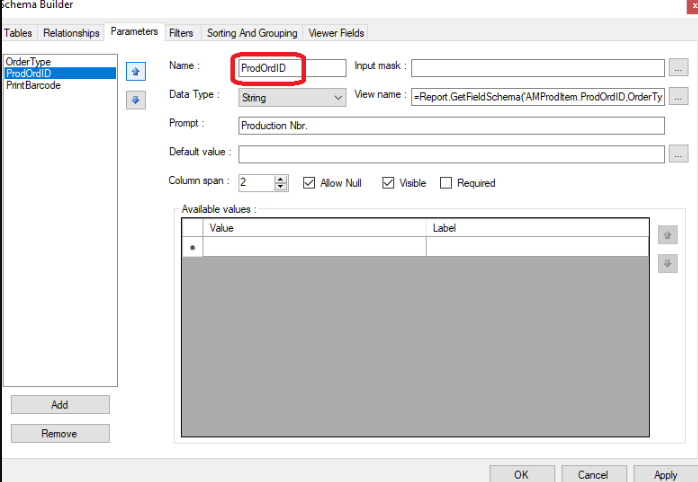 Modify on Schema on Production order form (AM625010). Rename the Parameter from Production_Nbr to ProdOrderID as below and re-try the print