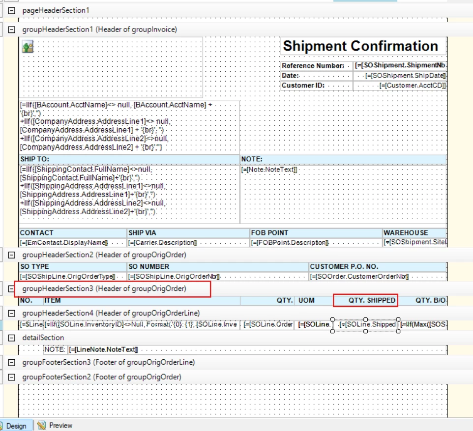 Step 5: Replace the [SOLine.ShippedQty] text field with [SOShipLine.ShippedQty] by dragging and dropping the field.