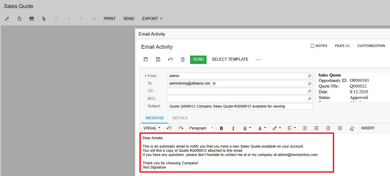 If an email template was specified in the report editor and the Include in New Emails check box was selected for the email signature in the user's profile on the User Profile (SM203010) form, the signature overrode the template body in generated emails